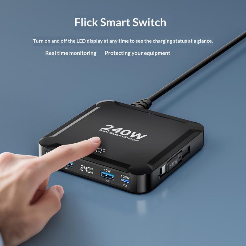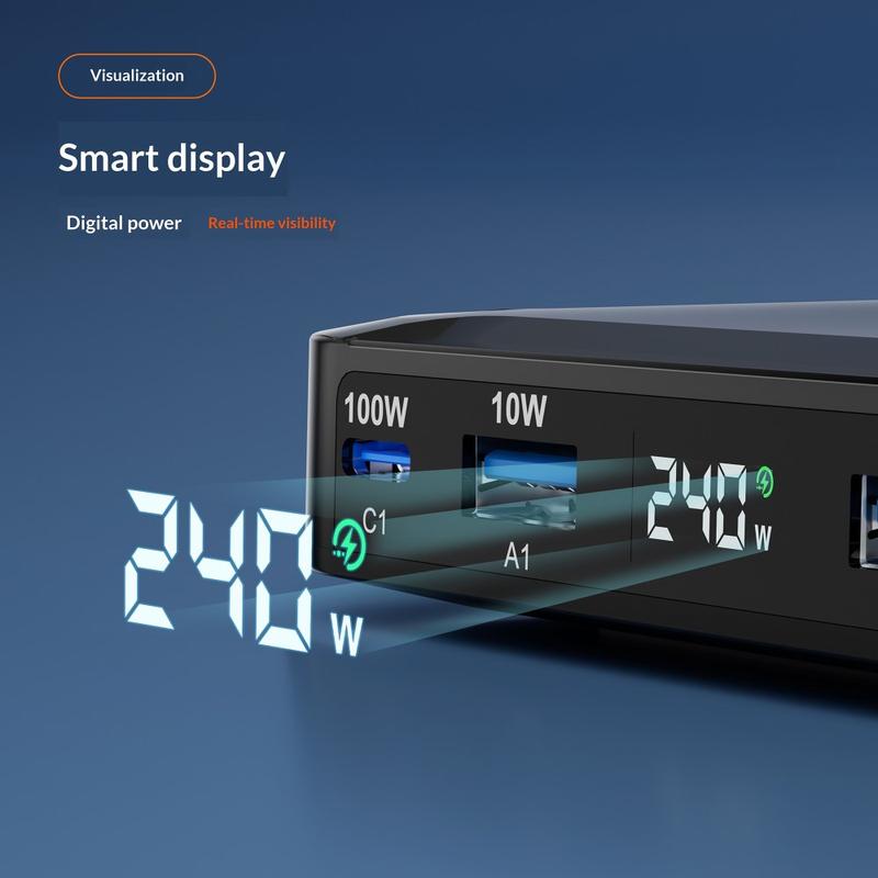 Un écran numérique LED intelligent affiche les informations d'alimentation en temps réel, notamment la puissance totale et l'activité des ports, ce qui vous permet de surveiller plus clairement l'état de la recharge. Le commutateur tactile de l'écran facilite également l'extinction de l'écran lorsque vous souhaitez une pièce plus sombre la nuit. La protection de sécurité intelligente intégrée contribue à une recharge plus sûre en ajustant automatiquement la sortie et en protégeant contre la surchauffe, les surintensités, les surtensions et les courts-circuits.