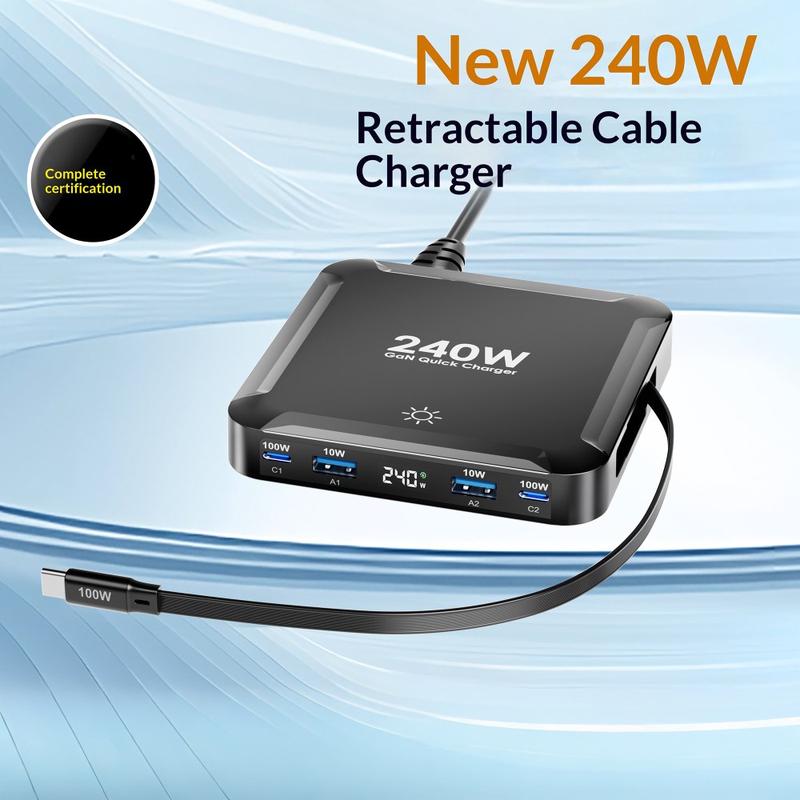 • Station de recharge de bureau BK-124D 240W avec câble USB-C rétractable - Hub de recharge rapide avec 2 ports USB-C et 2 ports USB-A, écran LED et prise européenne