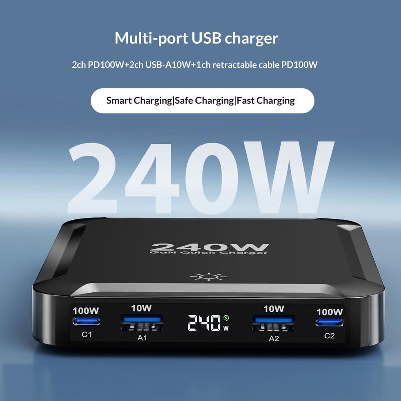 Rechargez plusieurs appareils plus efficacement grâce à la station de recharge de bureau BK-124D, un hub de recharge pratique à haut débit conçu pour les bureaux, les tables de chevet et les espaces de travail modernes. Avec une puissance totale pouvant atteindre 240W, ce chargeur 5-en-1 compact combine 2 ports USB-C, 2 ports USB-A et un câble USB-C rétractable intégré, ce qui en fait une excellente solution pour recharger téléphones, tablettes, ordinateurs portables, écouteurs, batteries externes et autres appareils du quotidien à partir d'une seule station centrale.