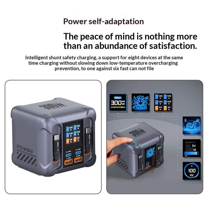 • Station de recharge de bureau HW866 300W à technologie GaN avec écran LCD - Chargeur à 6 ports avec 2 câbles USB-C rétractables, prise européenne