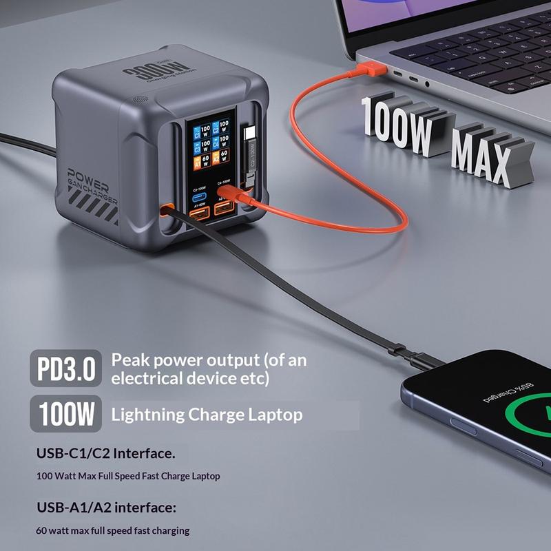 - Puissance de sortie totale pouvant atteindre 300W pour alimenter plusieurs appareils à partir d'un seul chargeur de bureau