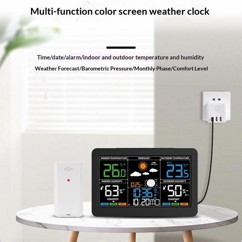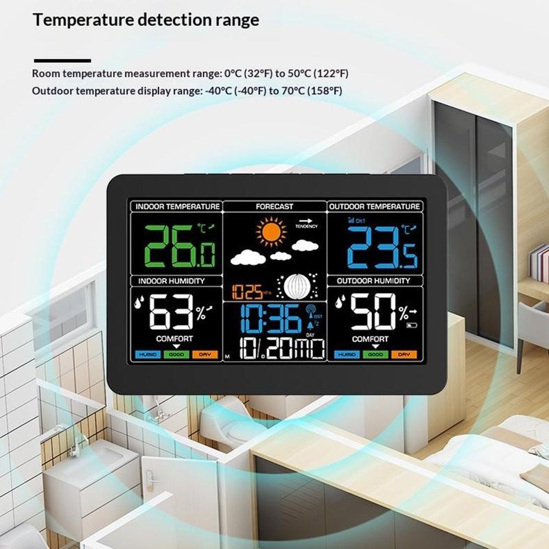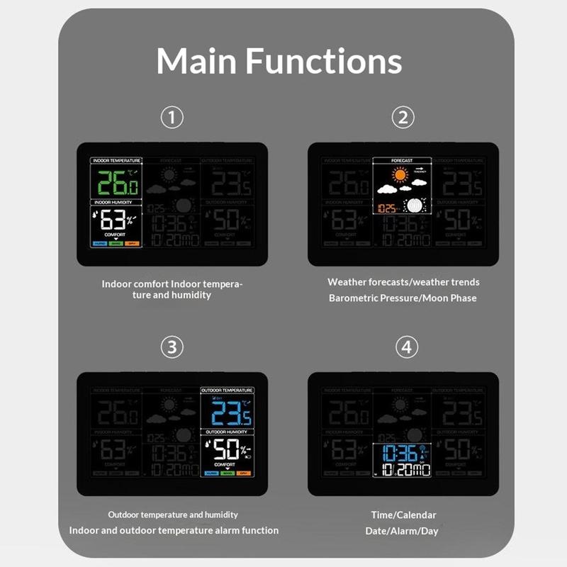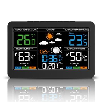 Cette station météo sans fil réunit en un seul appareil pratique l'heure, la date, une alarme, la température intérieure et extérieure, la mesure de l'humidité, les prévisions météo, la pression atmosphérique, les phases lunaires et l'affichage du niveau de confort. Dotée d'un grand écran couleur et d'une présentation claire, elle est un complément utile pour une chambre, une cuisine, un bureau ou un salon. Elle vous permet de consulter d'un seul coup d'œil les informations quotidiennes importantes tout en contribuant à mieux organiser votre espace.