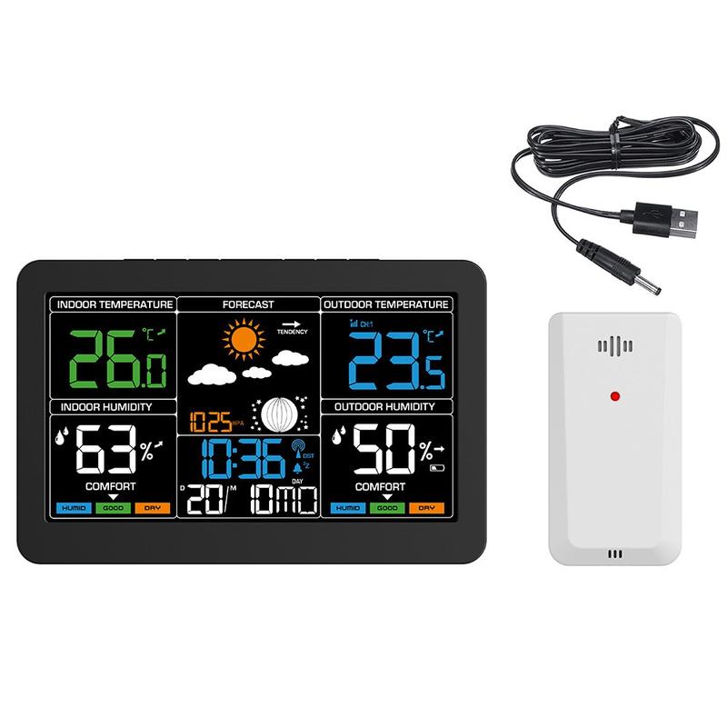 Station météo avec grand écran couleur, capteur d'extérieur, thermomètre, hygromètre et réveil