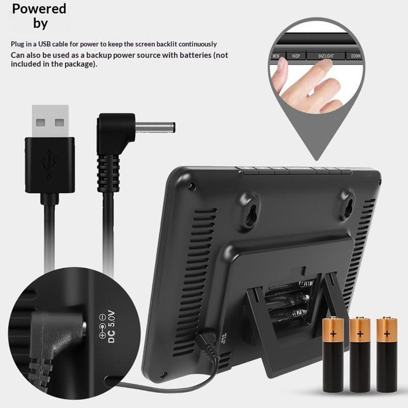 La station météo peut être alimentée par USB pour un affichage continu et le fonctionnement du rétroéclairage, tandis que la batterie de secours permet de la maintenir en état de marche en cas de coupure de courant. Cette double alimentation offre fiabilité et flexibilité, en particulier pour les utilisateurs qui souhaitent un affichage stable avec une solution de secours.
