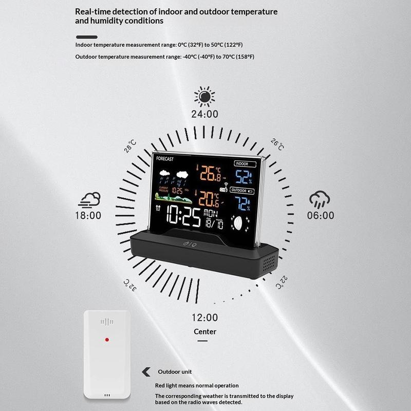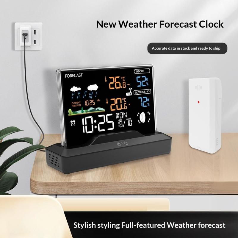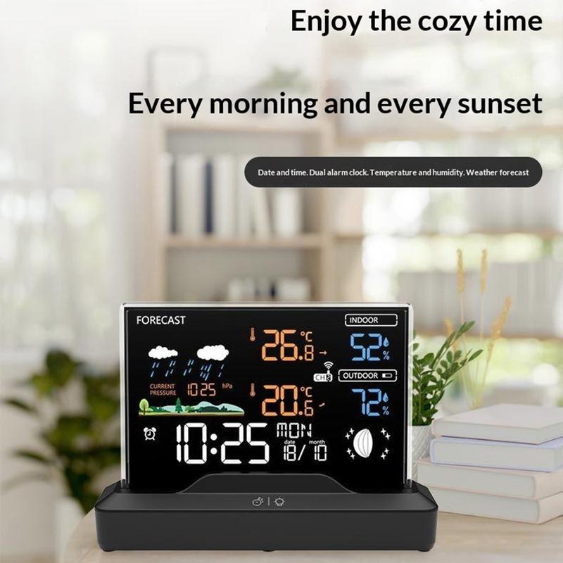 Cette station météo sans fil combine la mesure de la température intérieure et extérieure, la surveillance de l'humidité, les prévisions météorologiques, des fonctions de réveil et la mesure de la pression atmosphérique dans un appareil de bureau pratique. Conçue pour un usage quotidien à la maison ou au bureau, elle vous permet de rester informé d'un seul coup d'œil du confort ambiant et des conditions extérieures. Son écran LCD couleur et sa présentation claire en font un accessoire utile sur une table de chevet, un bureau, un plan de travail de cuisine ou une étagère du salon.