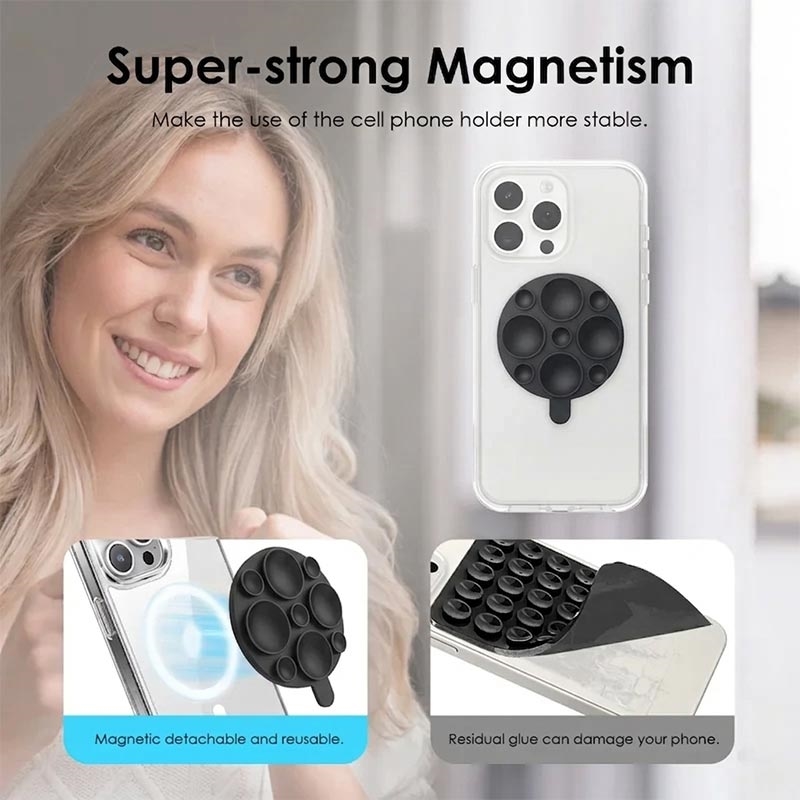 Fabriqué en silicone souple, il offre un toucher agréable, une bonne prise en main et une durabilité fiable pour un usage quotidien. La conception magnétique puissante permet de maintenir en place les téléphones compatibles MagSafe, tandis que la base à ventouse crée une installation mains libres stable pour différentes situations à la maison ou en déplacement. Léger et facile à transporter, c'est un accessoire pratique pour les utilisateurs qui souhaitent un support rapide pour leur téléphone sans supports encombrants ni installation compliquée.