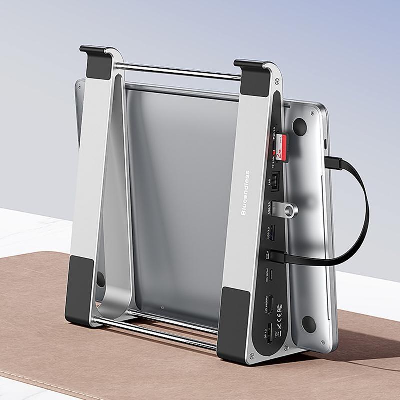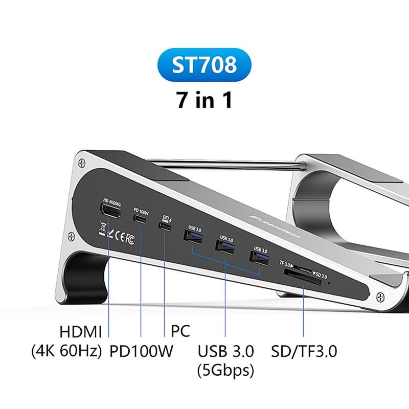 Support pour ordinateur portable 7 en 1 Blueendless ST708 avec concentrateur USB - HDMI 4K@60Hz, charge PD 100 W, 3 ports USB 3.0, lecteur de carte TF, rehausseur en aluminium pour ordinateur portable