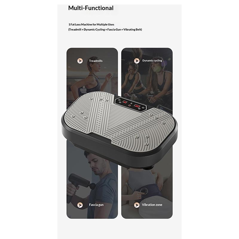 La plateforme vibrante SZJ-04 combine plusieurs concepts d'entraînement en un seul appareil compact, simulant les effets d'un tapis roulant, d'un vélo d'appartement, d'un massage fascial et d'une ceinture vibrante. Elle est conçue pour les entraînements complets du corps, le raffermissement musculaire et les activités quotidiennes à domicile.