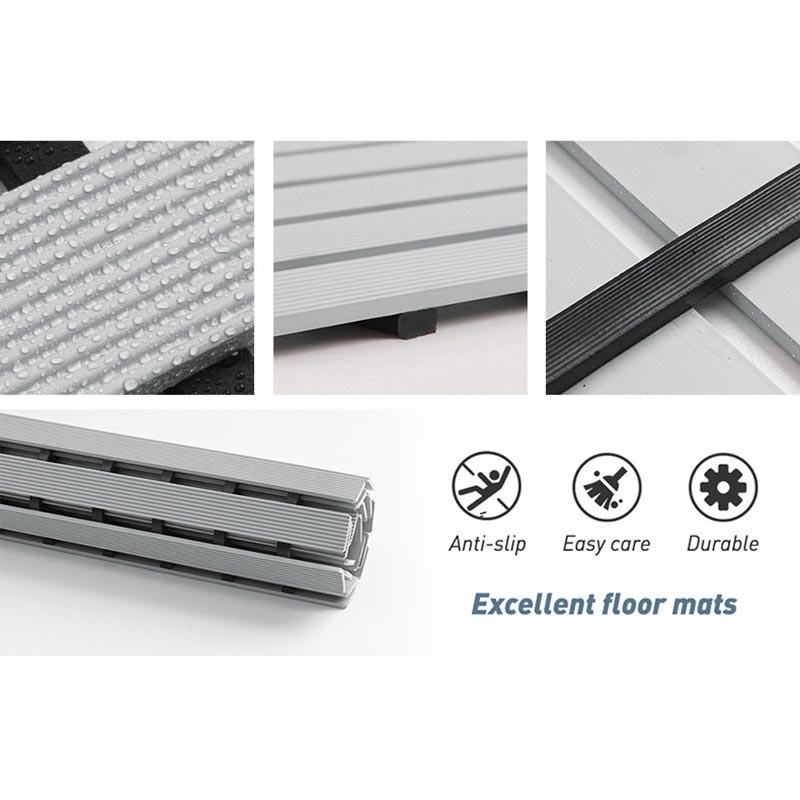 Doté de larges fentes de drainage stratégiquement placées, le tapis permet à l'eau de s'écouler rapidement, évitant ainsi la formation de flaques et aidant le sol à sécher plus rapidement. Cela réduit également le risque de développement de moisissures et de zones obstruées.