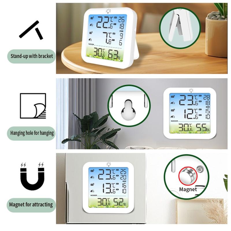 L'écran clair affiche les données de température et d'humidité, tandis que l'alarme personnalisable de haut et bas niveau vous avertit lorsque les mesures sortent de la plage que vous avez définie. Avec une transmission sans fil jusqu'à 100 m en espace dégagé, un enregistrement des valeurs maximales et minimales sur 24 heures et des options de placement flexibles, c'est une solution utile pour la surveillance à domicile, en milieu commercial et dans les zones de stockage.