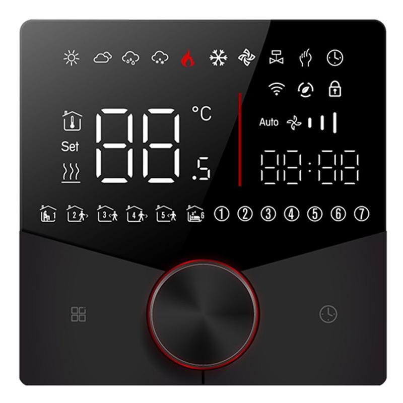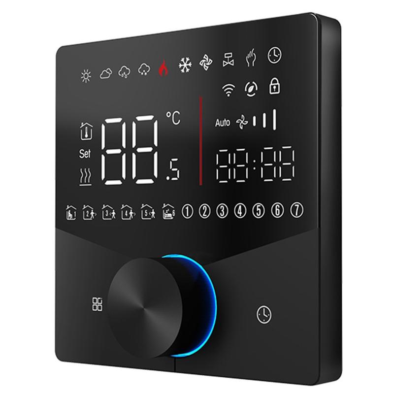 L'écran LCD épuré et les boutons tactiles capacitifs offrent une interface fluide et conviviale. Son panneau encastré ultra-fin, son aspect sans cadre et ses coins arrondis lui permettent de s'intégrer parfaitement dans les intérieurs modernes. Qu'il soit installé dans une maison, un hôtel ou un bureau, ce thermostat offre un look épuré et minimaliste tout en restant simple à utiliser au quotidien.