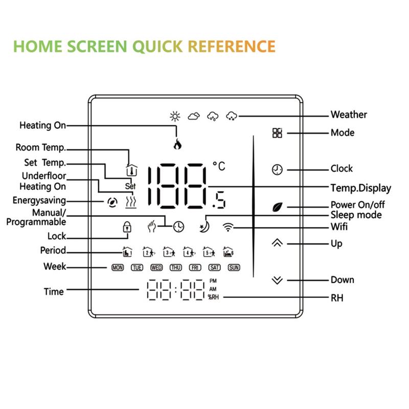 Ce thermostat présente une façade élégante sans cadre, dotée d'un écran LCD de 3 pouces et de bords incurvés 2,5D pour un look épuré et moderne. Les boutons tactiles capacitifs dissimulés préservent l'aspect minimaliste tout en garantissant une utilisation simple et intuitive. L'écran LED multicolore permet de vérifier facilement les réglages et de surveiller les conditions ambiantes d'un seul coup d'œil.