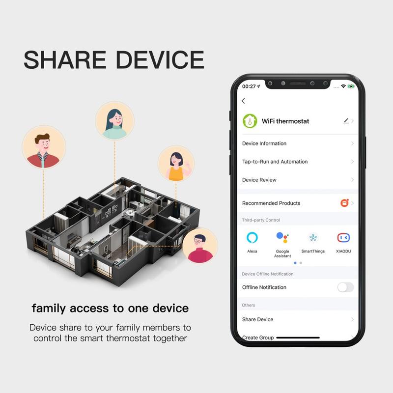 Le thermostat intelligent BHT-002 est conçu pour rendre le contrôle du chauffage par chaudière plus simple, plus précis et plus pratique au quotidien. Avec son design moderne, son format compact pour montage mural et son écran tactile LCD de 3 pouces, il constitue un complément pratique pour les maisons, les appartements, les bureaux et autres espaces intérieurs similaires. Grâce à un affichage clair de la température et à des options de connectivité intelligente, il vous aide à gérer le confort intérieur avec moins d'efforts.