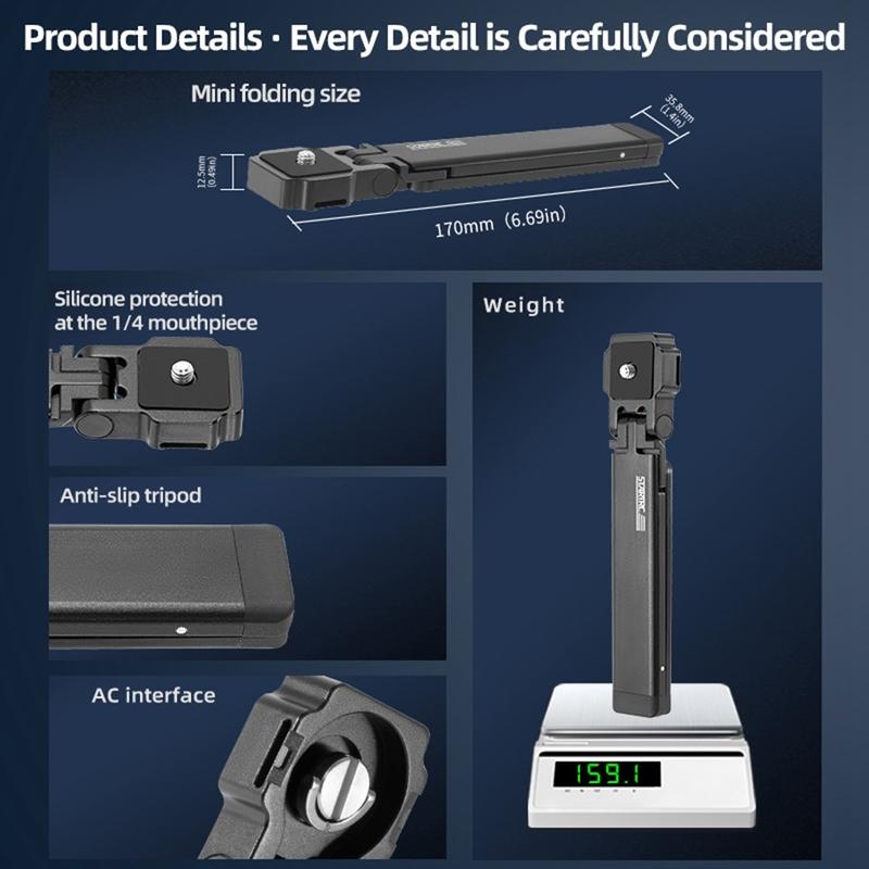 Fabriqué à partir d'un alliage d'aluminium de qualité aérospatiale, le trépied ne pèse que 160 g tout en offrant une excellente résistance et une excellente résistance à la corrosion. La finition anodisée améliore la durabilité pour une utilisation en extérieur et par tous les temps.