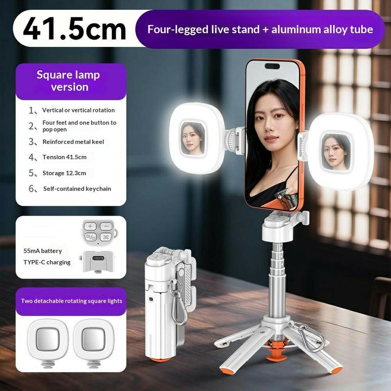 Ses pieds de trépied à ouverture automatique offrent une stabilité immédiate une fois posé, tandis que sa conception extensible et son support de téléphone rotatif permettent de passer facilement d'un angle de prise de vue à l'autre et d'un format à l'autre. La télécommande Bluetooth incluse vous aide à prendre des photos en mode mains libres, et les deux lumières d'appoint carrées apportent une luminosité supplémentaire pour vos selfies, vos appels vidéo et vos enregistrements.