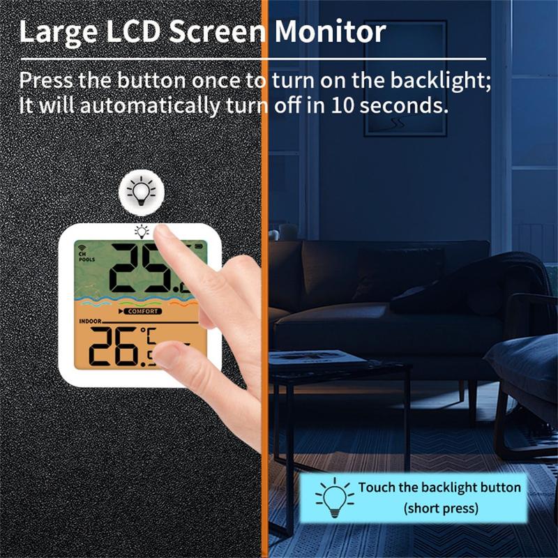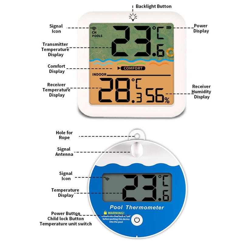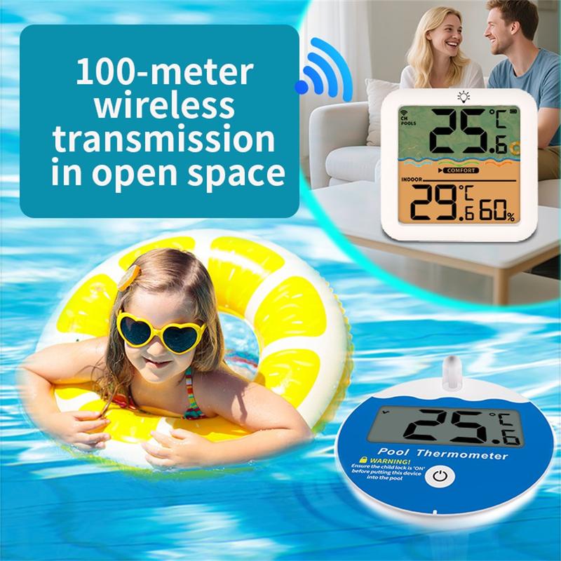 L'émetteur flottant IP68 se place directement dans l'eau pour des mesures précises, tandis que le récepteur d'intérieur affiche la température de la piscine, la température ambiante et l'humidité sur un écran clair. Avec une portée sans fil allant jusqu'à 100 m en espace ouvert, une mémoire des valeurs maximales et minimales sur 24 heures et des options de fixation pratiques, c'est un choix judicieux pour les piscines, les bains à remous, les spas et les installations aquatiques de jardin.