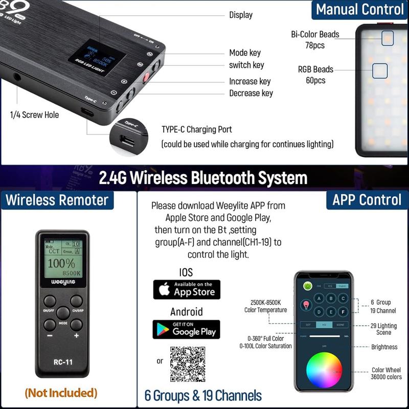 Weeylite RB9 Lumière vidéo RVB portable 2500-8500 K avec contrôle par application