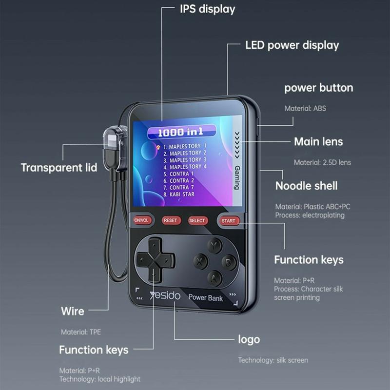 Le YESIDO YP87 est un appareil 2-en-1 unique qui combine une puissante banque d'énergie de 10000mAh avec une console de jeu portable rétro. Conçu pour le divertissement et la recharge quotidienne, il vous permet d'alimenter vos appareils tout en profitant des jeux classiques sur un écran IPS de 2,8 pouces. Compact et léger, c'est le compagnon idéal pour les voyages, les déplacements et les temps morts.