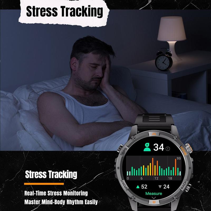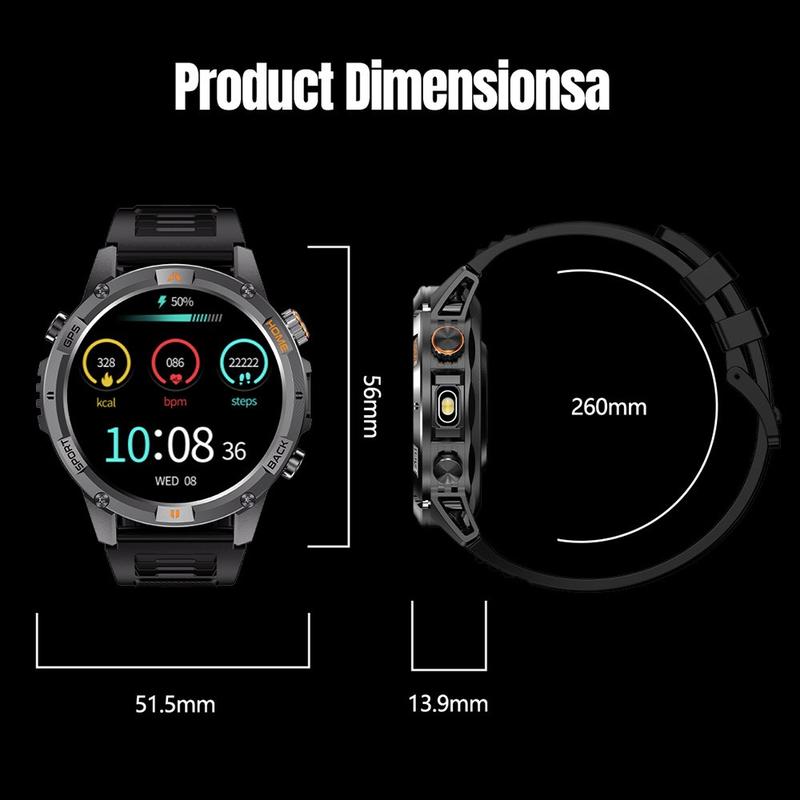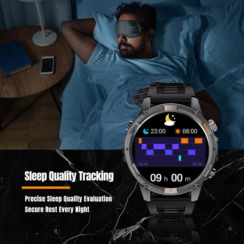 Conçue pour les aventures en plein air, la montre est dotée d'une lampe de poche intégrée, d'un système de positionnement GPS et d'une boussole numérique, ce qui vous permet de naviguer sur les sentiers et de suivre vos itinéraires en toute confiance. Sa batterie haute capacité de 580 mAh offre des performances durables, jusqu'à 40 jours d'autonomie en veille et environ 7 jours d'utilisation régulière. Avec un indice d'étanchéité IP68, il résiste à la pluie, aux éclaboussures et à la baignade sans souci.